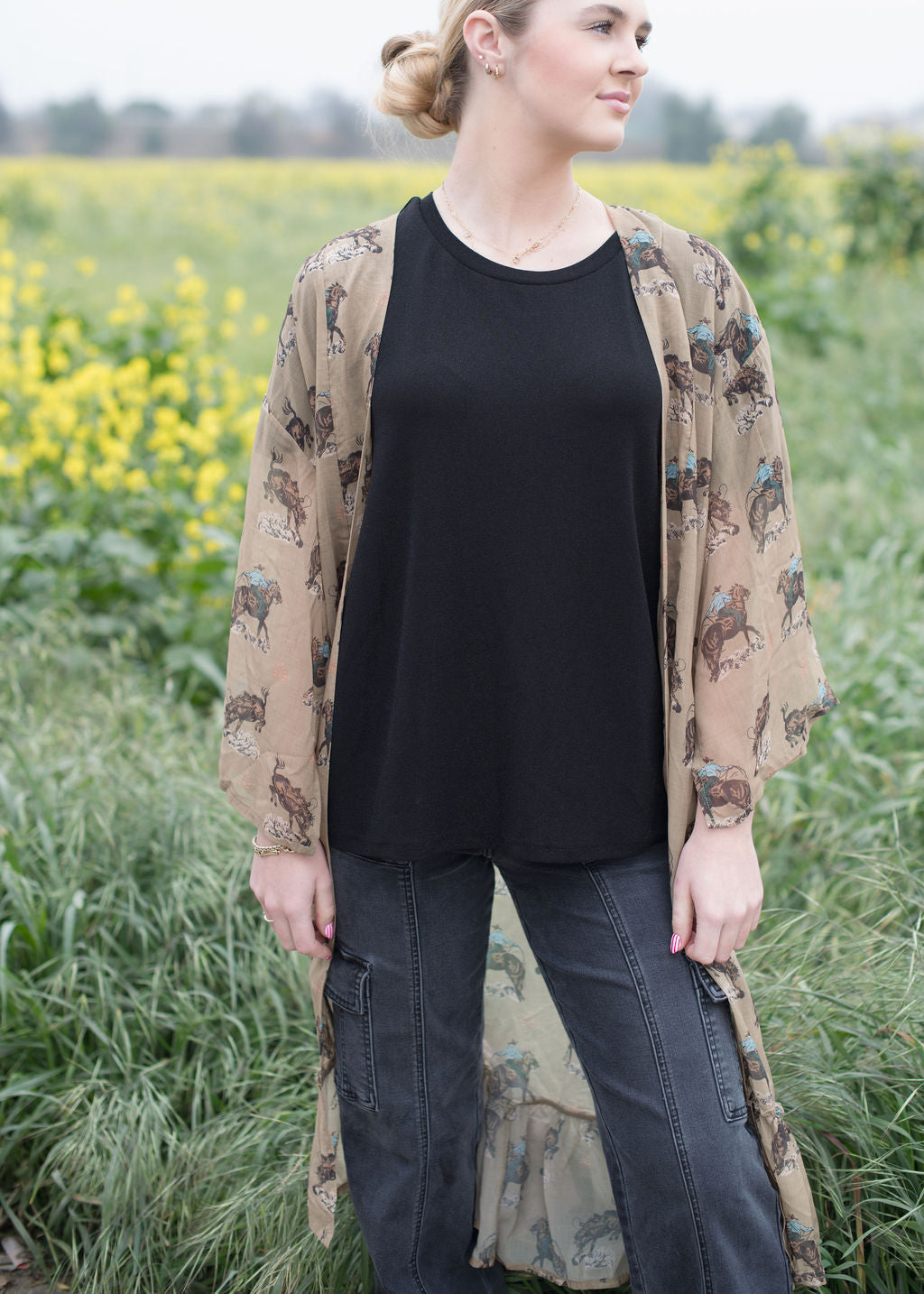 Saddle up in style with the Katie Duster—your go-to layer for that effortless Western charm. Lightweight and versatile, this duster pairs perfectly with your favorite jeans and boots for an authentic cowgirl look that turns heads. Whether you're hitting the ranch or the town, this piece brings that classic Western flair with a modern twist.