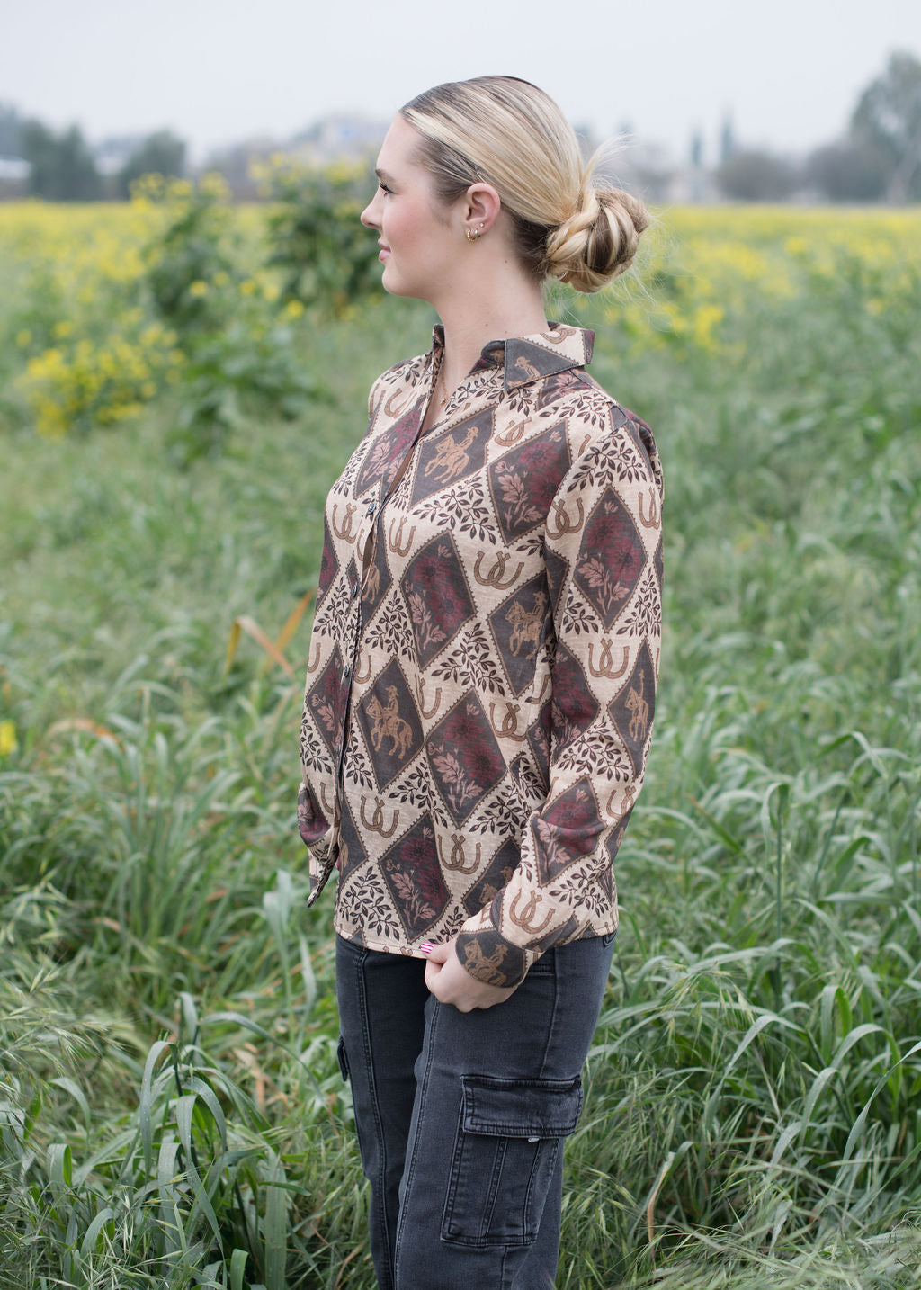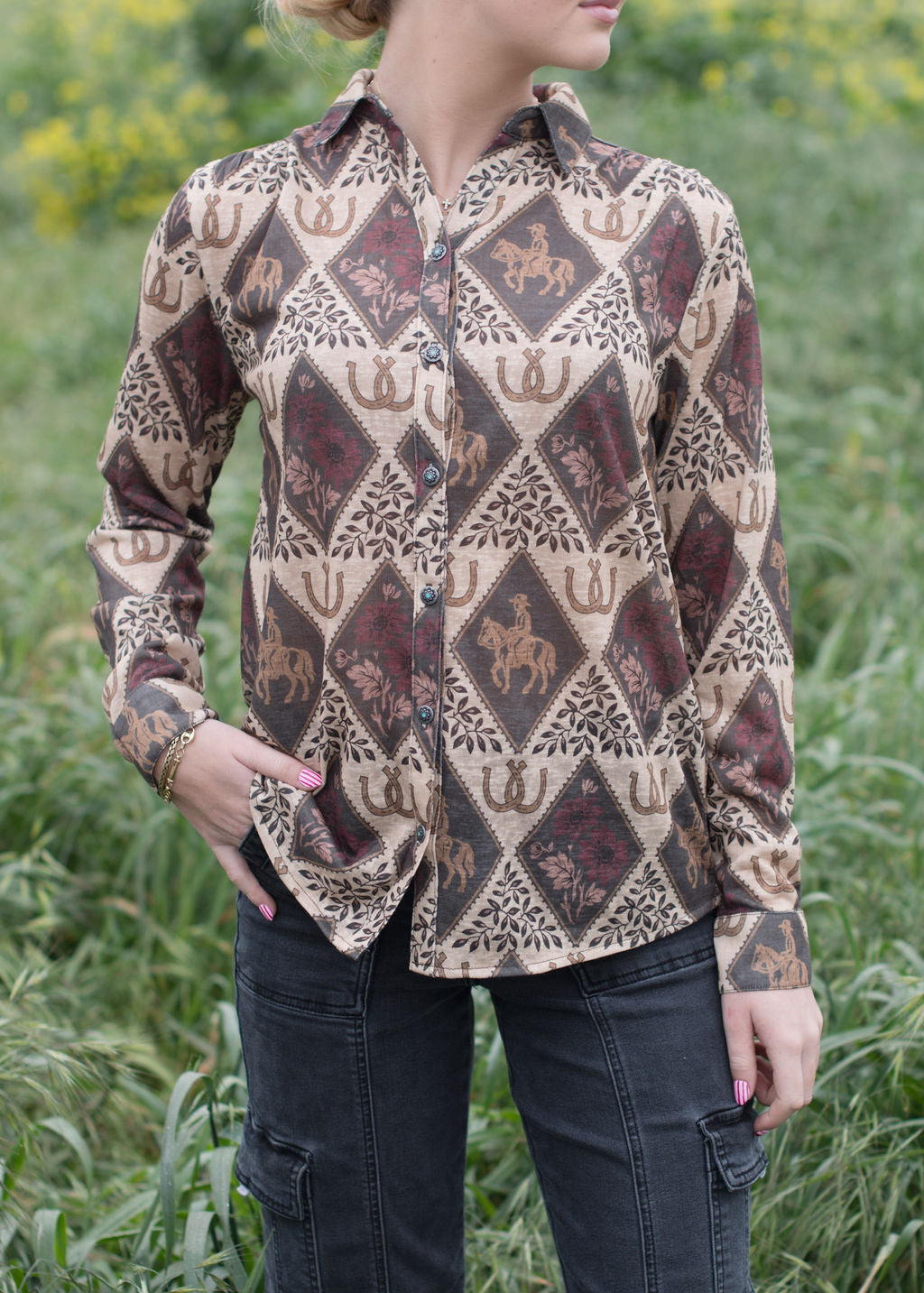 Saddle up in style with the Trish Western Blouse! This charming piece brings that classic cowgirl vibe with modern flair. Perfect for ranch days or nights out, it's your go-to for effortless Western charm that turns heads.