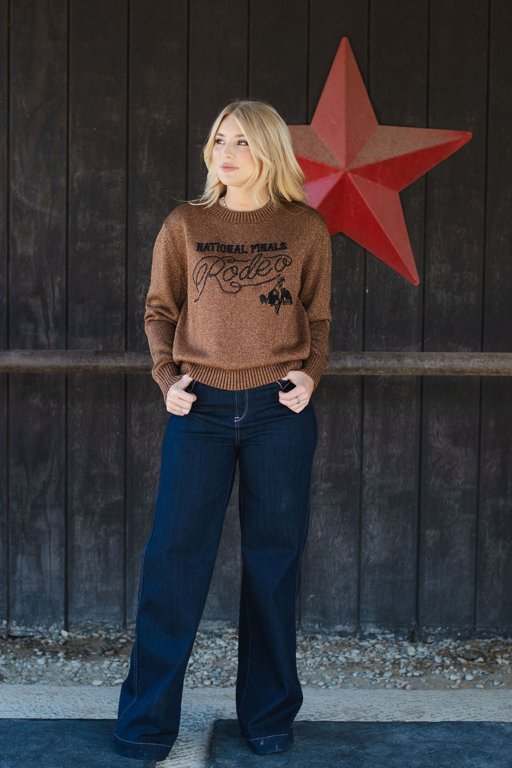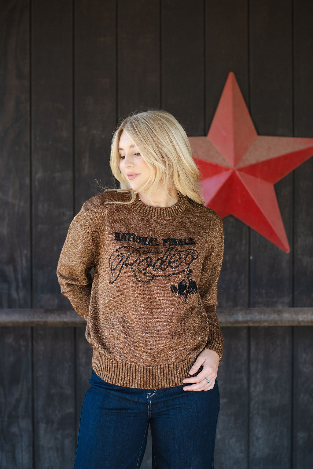 The NFR Shimmer Sweater brings sparkle to the showdown with a soft touch of glam and cowgirl grit. Featuring subtle metallic threads and a flattering fit, it’s the perfect piece to light up your look at the National Finals Rodeo. Cozy, eye-catching, and made to shine from dusk till dance floor.