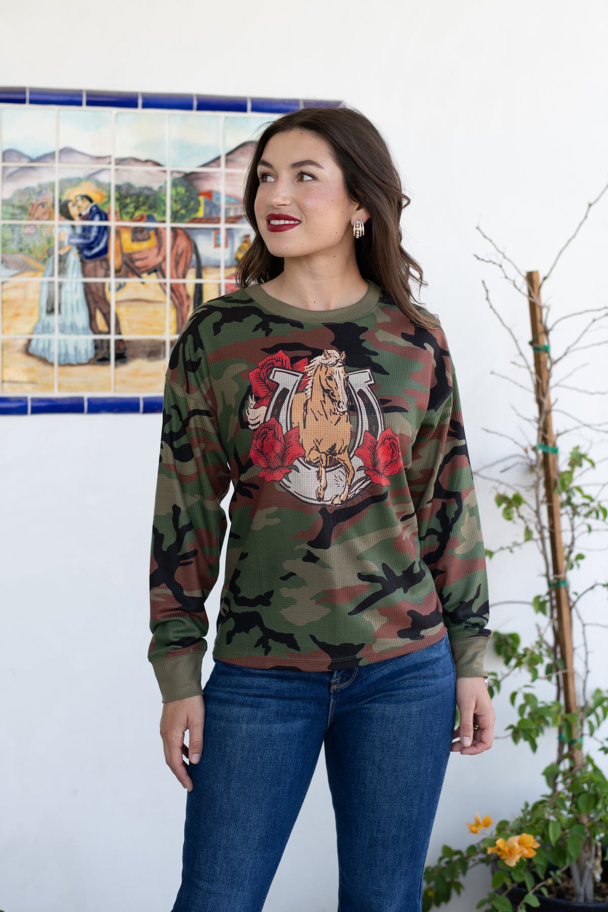 The Palomino Thermal brings together rugged comfort and cowgirl cool. With a camo base and a bold horse graphic, it’s made for crisp mornings, campfire nights, and everything in between. Soft, strong, and ready to ride—this one's built to keep up.