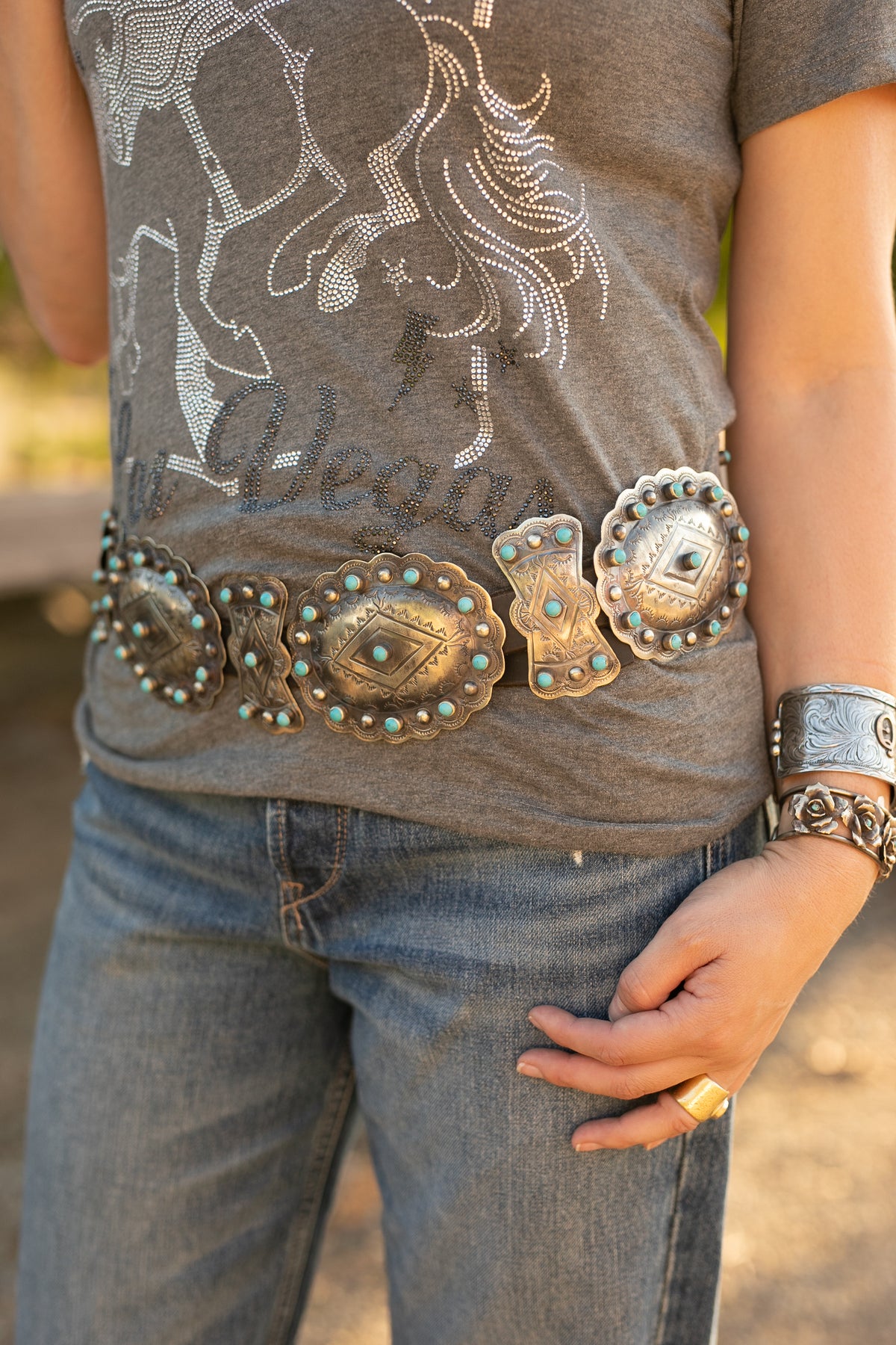 Upgrade your wardrobe with The Rodeo Drive Belt. Made with sterling silver, this elegant concho belt adds a touch of style to any outfit. Perfect for both casual and formal occasions, it's the ideal accessory for the fashion-forward individual.