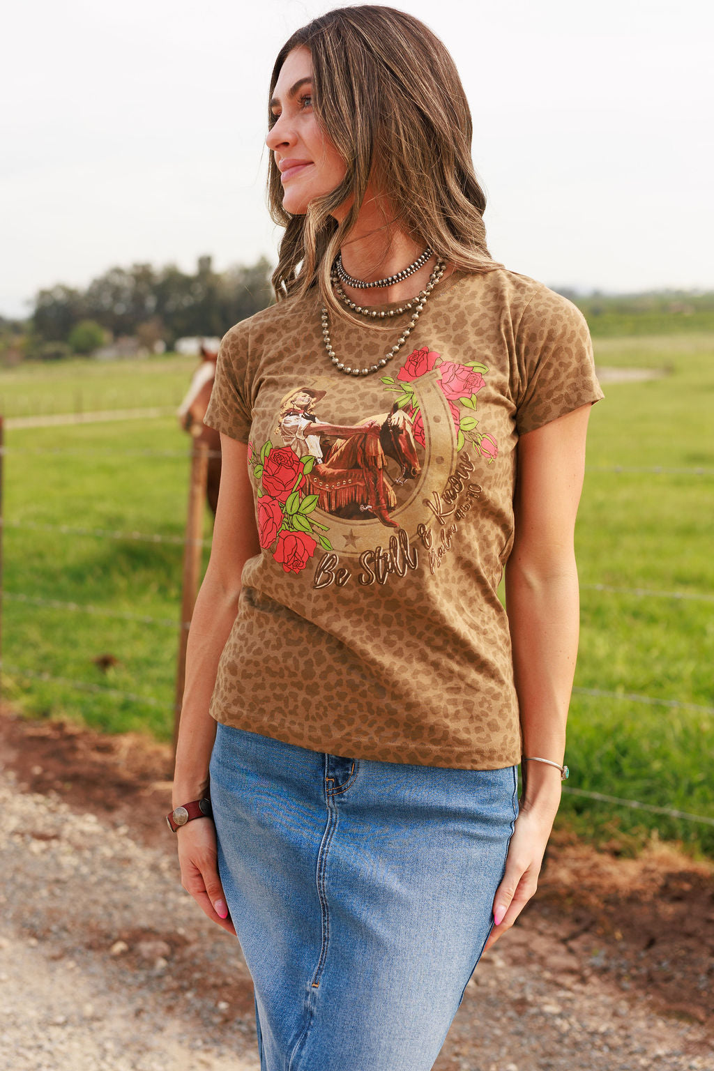 The Be Still & Know Tee is a reminder for the cowgirl who carries both fire and faith. In a world that moves fast, this piece calls you back to stillness- to trust, to surrender, to steady confidence. This design blends Western edge with soft femininity, featuring a cowgirl and her horse surrounded by roses, layered with subtle leopard detail and finished with a golden sparkle horseshoe. Sometimes the most powerful thing you can do is stand still and trust the One holding the reins.
