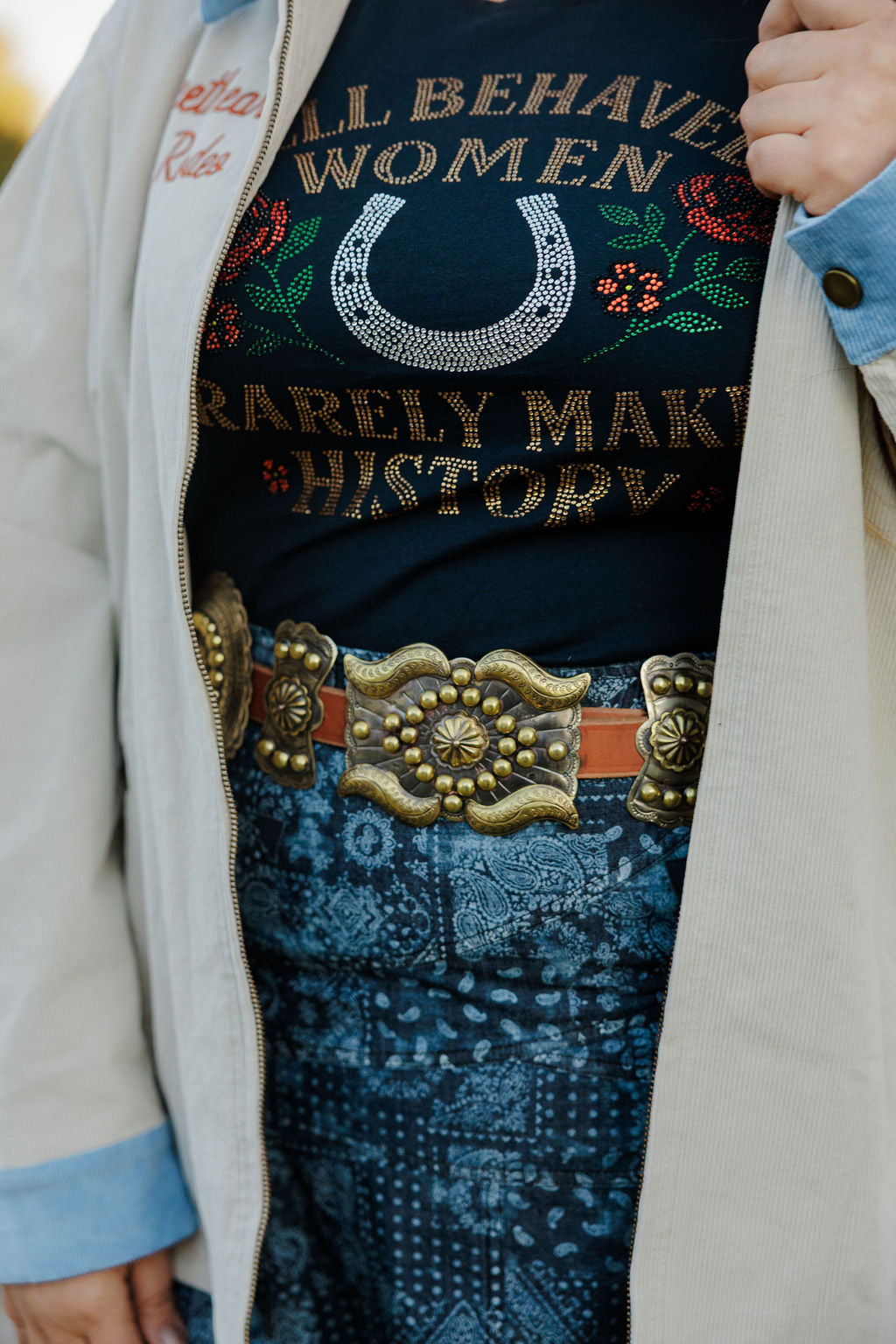 The Well Behaved Women Tee serves up bold Western sass with a timeless, lived-in feel. Its classic T shirt-style silhouette pairs effortlessly with the cheeky message, empowering every cowgirl to stand out, speak up, and ride her own trail. Comfortable, confident, and unapologetically yourself.