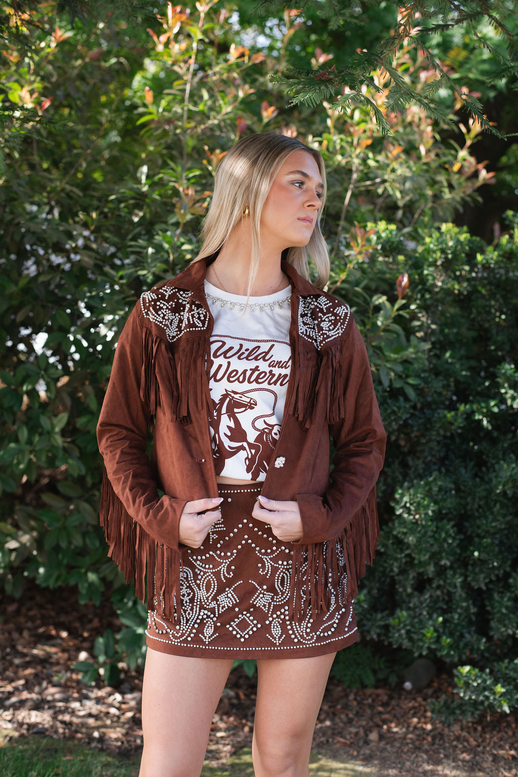 The Wildfire Wranglers Jacket is a show-stopping piece that combines classic Western style with a touch of elegance. Crafted from white leather, it’s adorned with sparkling diamonds and pearls on the front, with fringe cascading along the front, arms, and back.