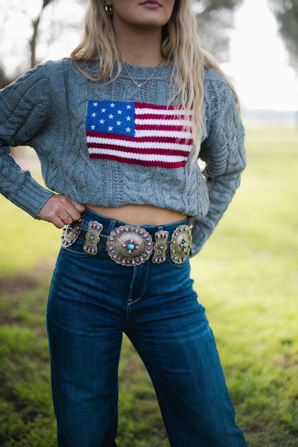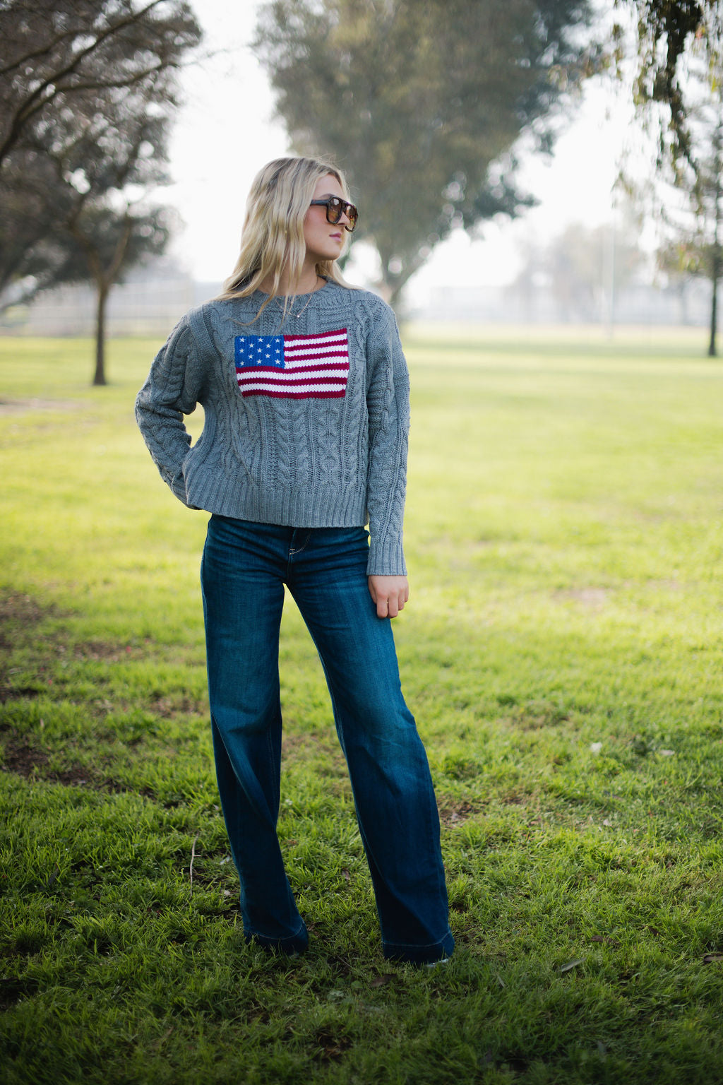 Wrap yourself in patriotic style with this cozy American Heritage Grey sweater. Featuring a bold American flag design on the front, it's the perfect blend of comfort and country spirit. Ideal for showing your pride in a way that feels effortlessly cool and undeniably charming.