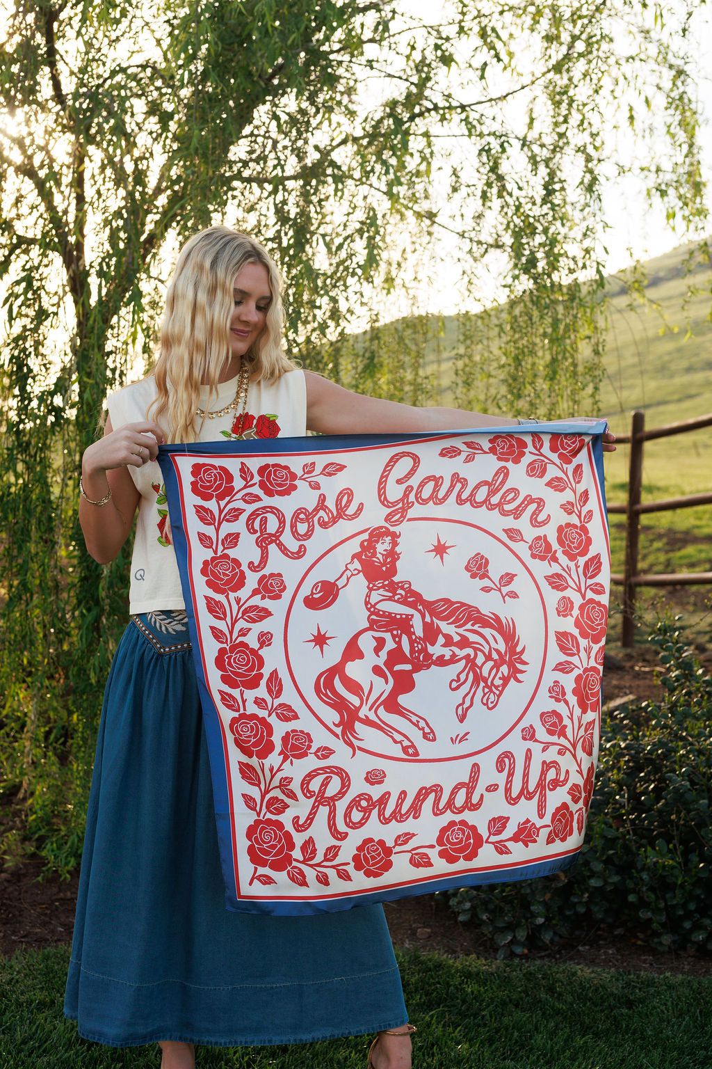 The Rose Garden Round Up Wild Rag is the ultimate finishing touch for your spring rodeo wardrobe. Crafted from luxurious 35x35 silk, this classic wild rag features a rich navy border and cream base adorned with red roses and a charming bronc riding cowgirl that captures the heart of western heritage. Timeless yet feminine, this silk western scarf ties effortlessly around your neck, in your hair, or on your bag for a polished look.