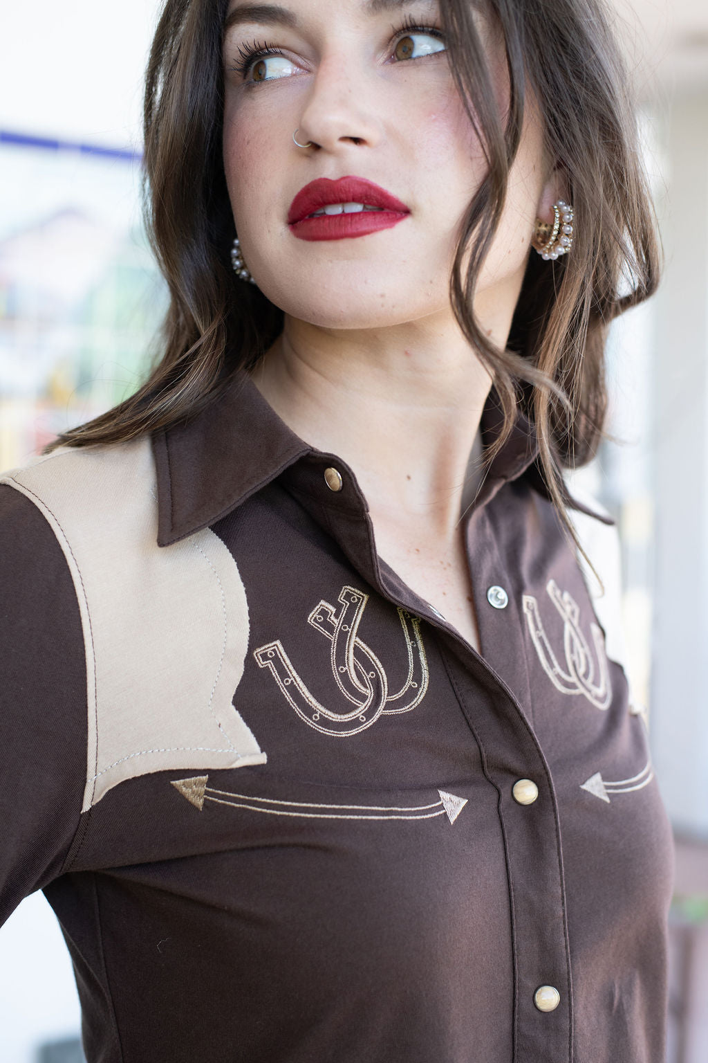 The Lucky Bucky Button Up is a Western classic with a Rodeo Quincy twist. 🤠 Featuring cream horseshoes and cowboy motifs on rich brown fabric, it’s a nod to rodeo heritage and good fortune. Wear it tucked, tied, or layered — it’s your lucky charm for every adventure, from the arena to the dance floor.